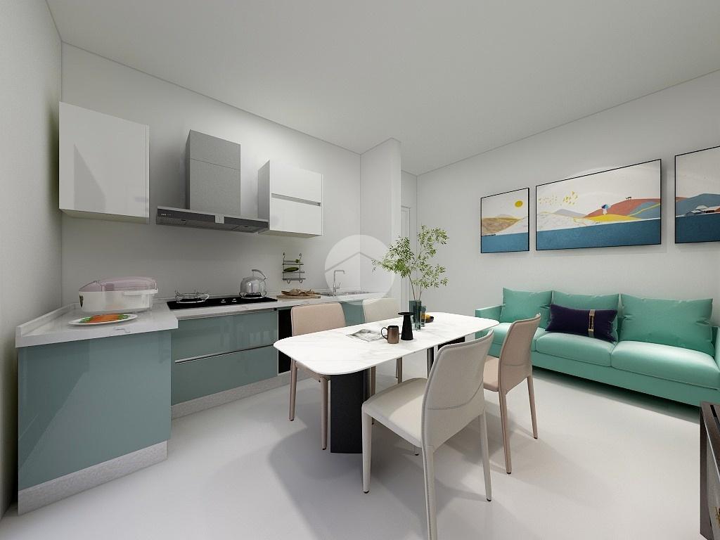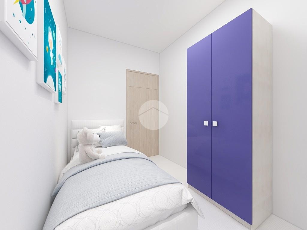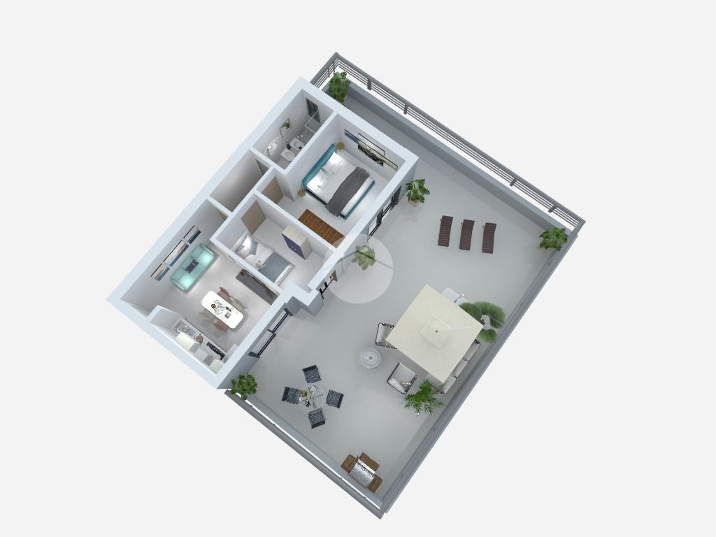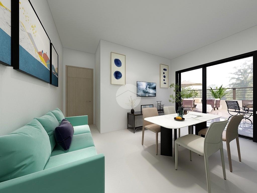 La soluzione prevede un’accogliente zona living con angolo cottura, collegata tramite disimpegno alla zona notte composta da camera matrimoniale, camera singola e bagno finestrato con box doccia.