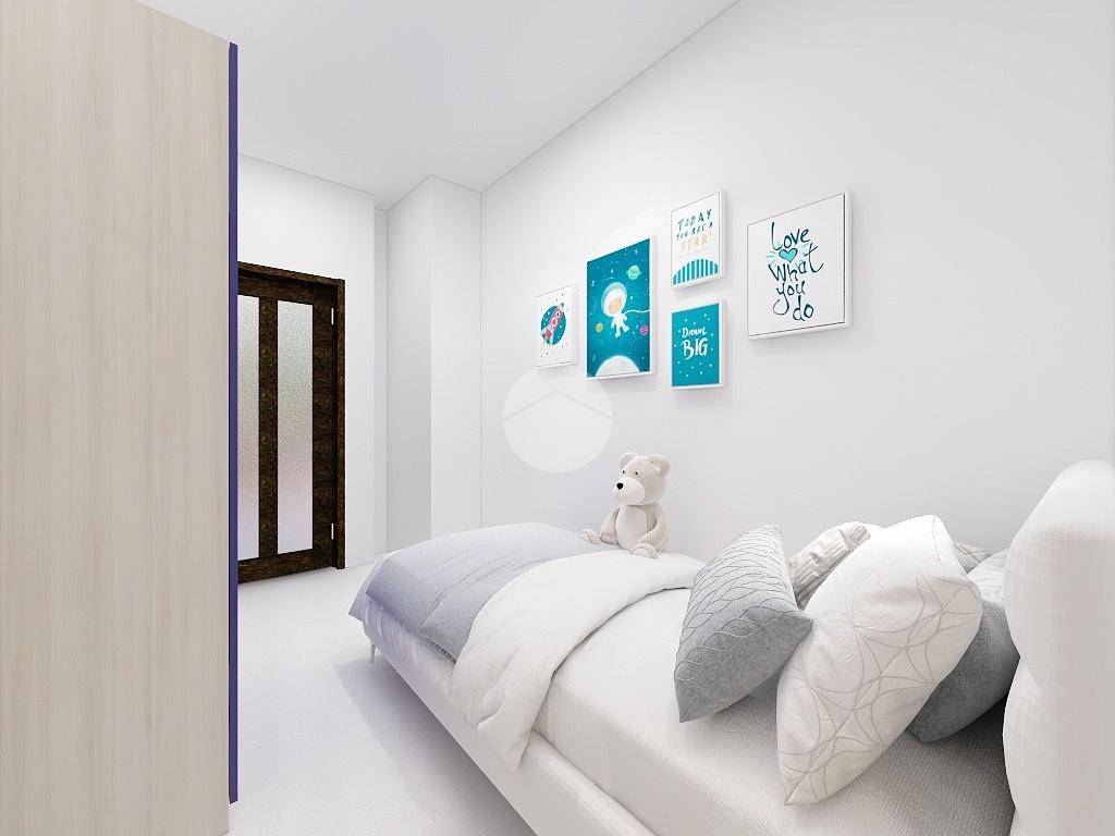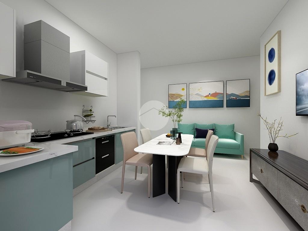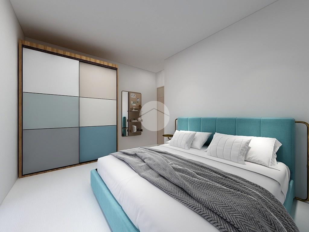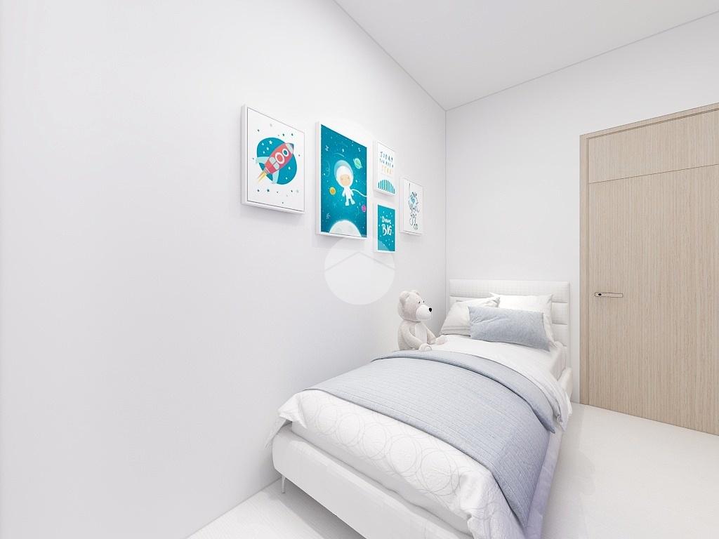 La soluzione prevede un’accogliente zona living con angolo cottura, collegata tramite disimpegno alla zona notte composta da camera matrimoniale, camera singola e bagno finestrato con box doccia.