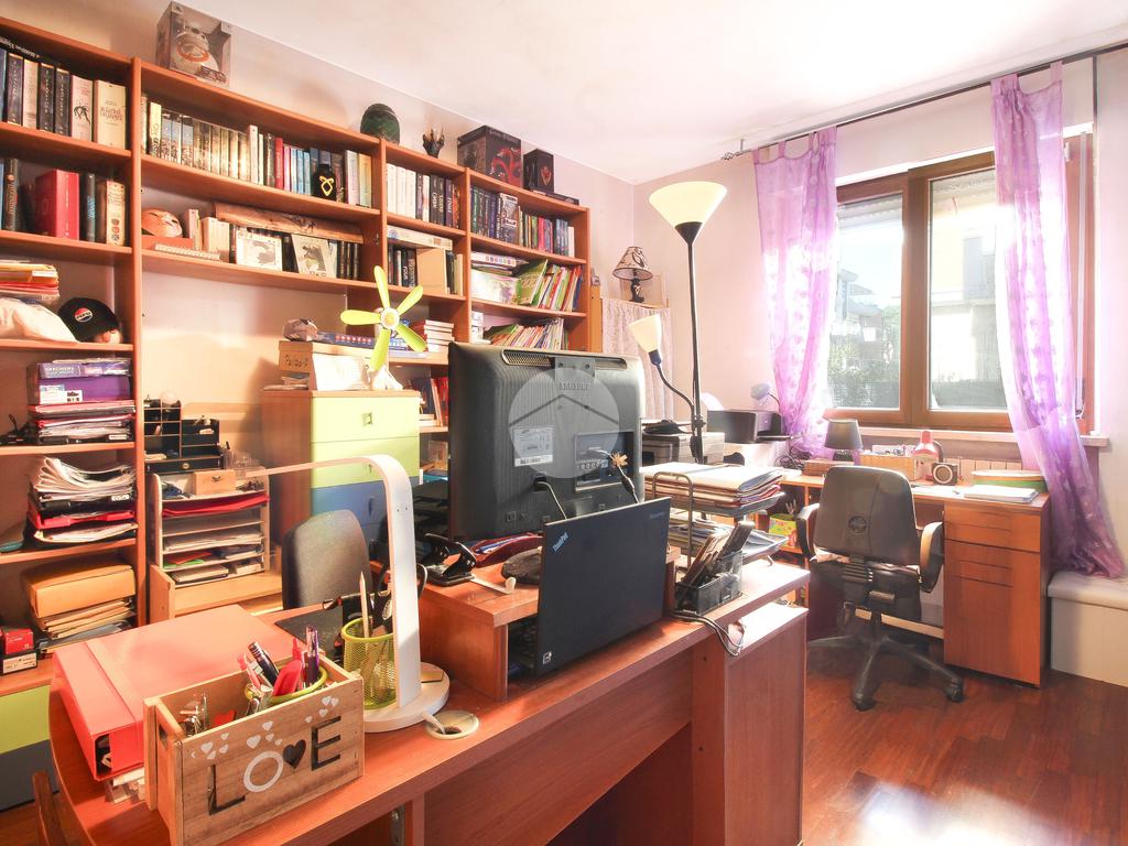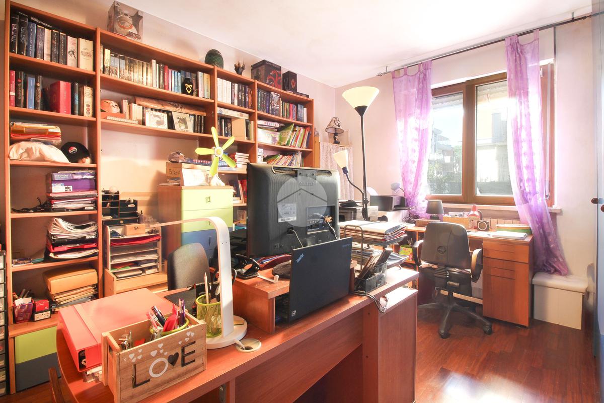 La soluzione presenta un ingresso su ampio soggiorno e cucina abitabile separata. Tramite disimpegno si accede alla zona notte composta da due camere da letto matrimoniali, uno studio e doppi servizi finestrati.