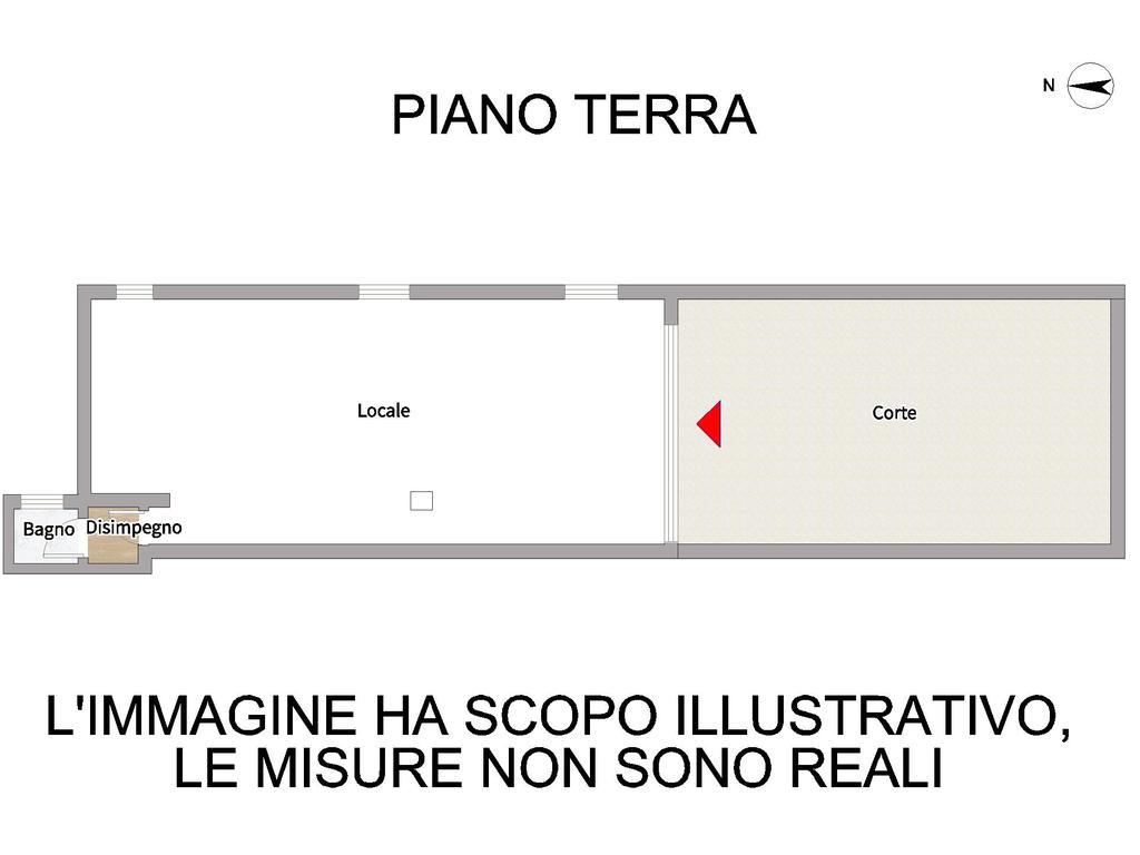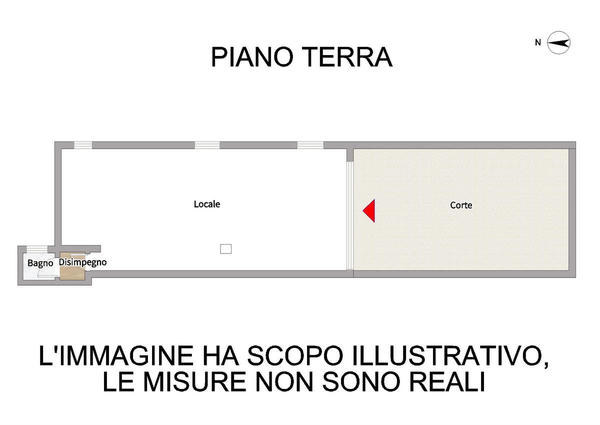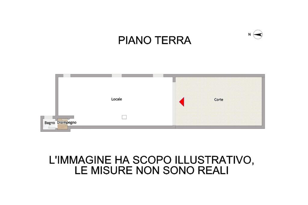 L'immobile al momento è suddiviso in due stanze open space, ripostiglio e bagno finestrato; oltre a corte esterna privata pavimentata.