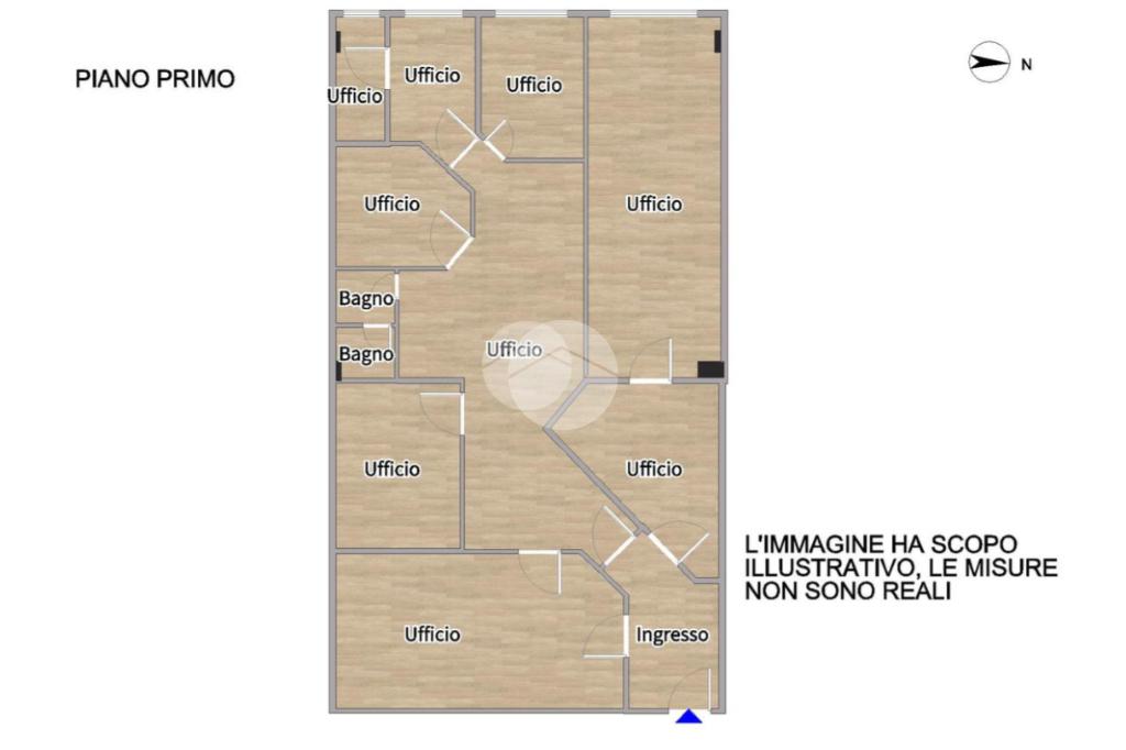 La soluzione internamente è suddivisa con ingresso su locale ricezione, troviamo diverse stanze ad uso ufficio, una grande sala riunioni e bagno.
