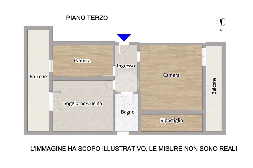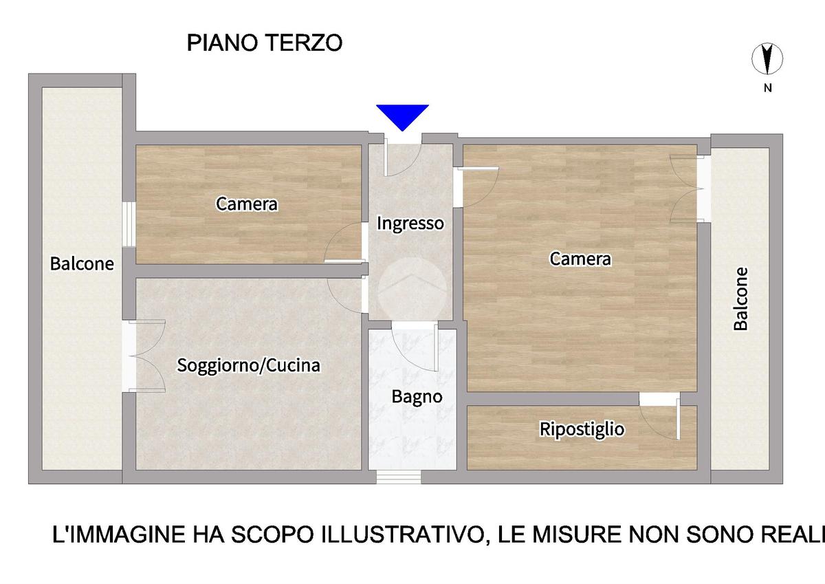 La soluzione si compone di ingresso, soggiorno con angolo cottura, due camere da letto e bagno finestrato con box doccia.