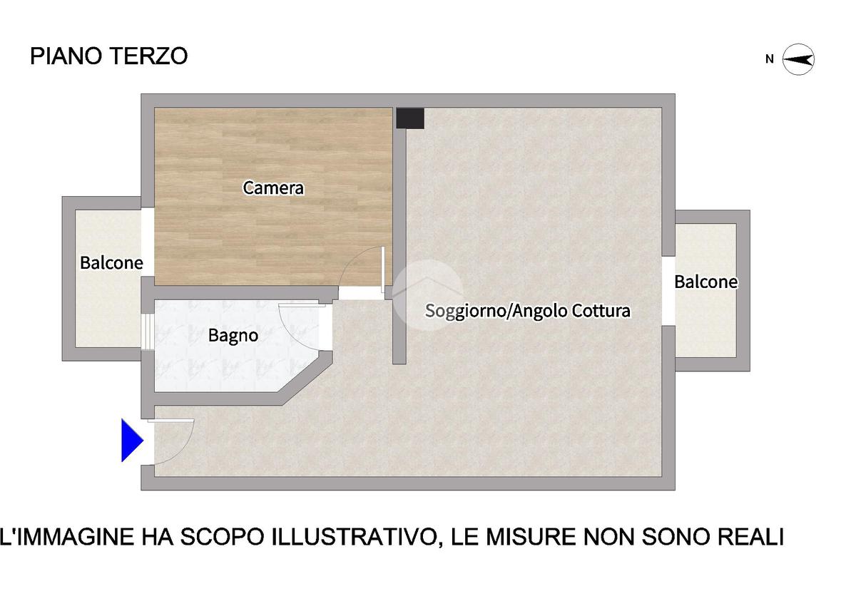 La soluzione si compone di ingresso che conduce al soggiorno con angolo cottura; tramite disimpegno si accede alla zona notte dove troviamo una camera da letto matrimoniale e bagno finestrato con box doccia.